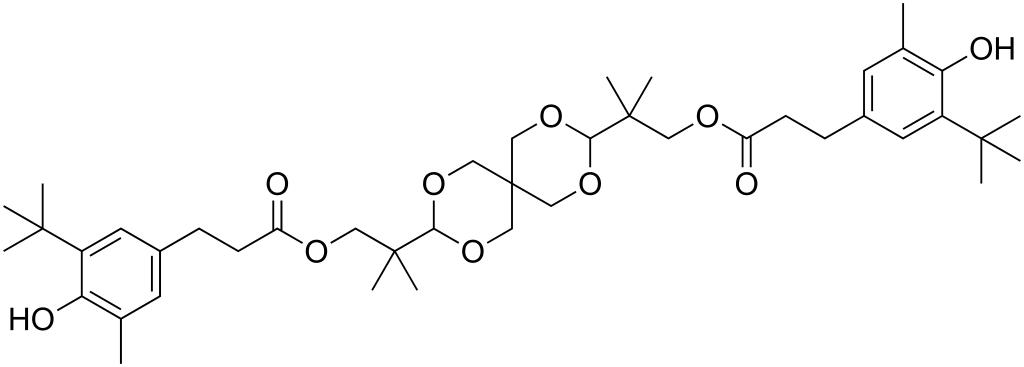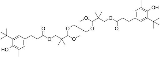 Keywords: PAO-3 100.svg validSVG Structure of 2 4 8 10-tetraoxaspiro5 5undecane-3 9-diylbis 2-methylpropane-2 1-diyl bis 3- 3- tert-butyl -4-hydroxy-5-methylphenyl propanoate Own 2014-03-21 Emeldir <span class signature-talk >talk</span> Chemical structure verified https //upload wikimedia org/wikipedia/commons/7/79/PAO-3_100 svg 1S/C43H64O10/c1-27-17-29 19-31 35 27 46 39 3 4 5 13-15-33 44 48-21-41 9 10 37-50-23-43 24-51-37 25-52-38 53-26-43 42 11 12 22-49-34 45 16-14-30-18-28 2 36 47 32 20-30 40 6 7 8/h17-20 37-38 46-47H 13-16 21-26H2 1-12H3 CGRTZESQZZGAAU-UHFFFAOYSA-N 90498-90-1 PD-chem Aging inhibitors