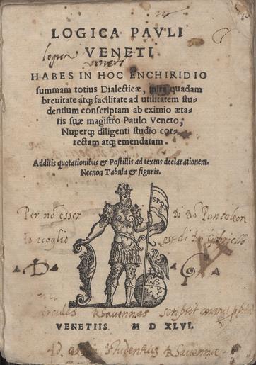 Keywords: Paolo - Logica, 1546 - 4629053.tif Book Paolo Veneto Logica Bartolomeo e Francesco Imperatore Venetiis lat it Logica Pauli Veneti habes in hoc enchiridio summam totius dialecticae mira quadam breuitate atque facilitate ad utilitatem studentium conscriptam ab eximio magistro Paulo Veneto Additis quotationibus postillis ad textus declarationem necnon tabula figuris - Venetiis s n 1546 - 59 i e 58 1 c ill ; 4ยบ - Marca tipografica sul frontespizio - Testo su due colonne in caratteri gotici - Errori di numerazione delle carte 53 55 58 - Appunti manoscritti dietro coperta nel verso carta 4 e contro coperta - Note di possesso su carta del frontespizio recto e verso BEIC 4629053 Institution BEIC PD-old-100-1923 Logica Philosophy History of science |