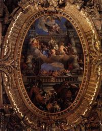 Keywords: Paolo Veronese - Apotheosis of Venice - WGA24943.jpg Artwork 1585 Oil on canvas size cm 904 579 Institution Palazzo Ducale Venice Sala del Maggior Consiglio object history credit line accession number WGA link 24943 http //www wga hu/art/v/veronese/08/maggior/1maggior3 jpg http //www wga hu/html/v/veronese/08/maggior/1maggior3 html PD-old-100 painting mythological Italian 1551-1600 Apotheosis of Venice by Paolo Veronese WGA form painting WGA type mythological WGA School Italian WGA time period 1551-1600 |