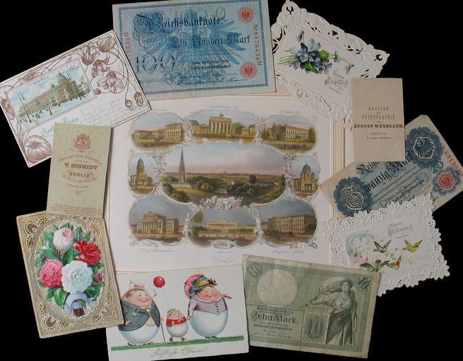 | Keywords: Paper usage.jpg Paper usage between 1850 and 1930 colored steel engraving on a souvenier sheet bank bills greetings cards luxury paper picture postcard small cards made from cardbox for photos photo by User Manfred Heyde from 1850 to 1930 PD-Art Paper |
