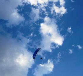 Keywords: parachute blue drifting blue sky white clouds open parachute parachutist skydiving falling air display