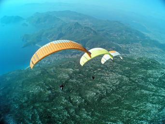 Keywords: paragliding parachute sky air paraglider freedom adventure extreme sport activity aerial view view land bay beach harness extreme sports people leisure outdoors blue blue sky summer sunny clear color day high landscape