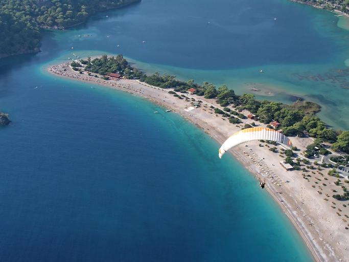 Keywords: paragliding parachute sky air paraglider freedom adventure extreme sport activity aerial view view land bay beach harness extreme sports people leisure outdoors blue blue sky summer sunny clear color day high landscape