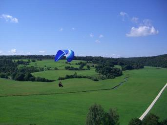 Keywords: paragliding pilot paraglider floating sailing sky blue castle hill huerbetal