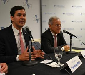 Keywords: groupshot people indoor Santiago Peña, minister of finance, Carlos Fernández, president of the Central Bank, and Germán Rojas, ambassador to the United States, joined Inter-American Dialogue President Michael Shifter for a conversation on Paraguay’s outlook. Photo by: Ben Raderstorf Santiago Peña, minister of finance, Carlos Fernández, president of the Central Bank, and Germán Rojas, ambassador to the United States, joined Inter-American Dialogue President Michael Shifter for a conversation on Paraguay’s outlook. Photo by: Ben Raderstorf |