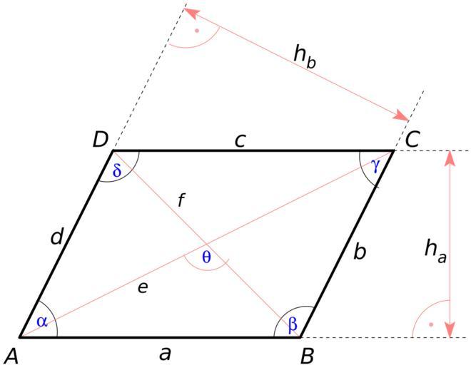Keywords: Parallelogram measures.svg Angles and such in a parallelogram own in 2004 Lars H Rohwedder User RokerHRO self made Parallelograms