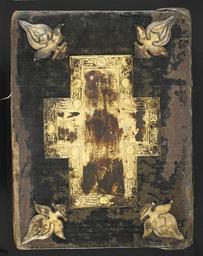 | Keywords: PARHAM MS XXI. Cruciform Gospel Lectionary - Lower Cover (Add ms 39603).jpg Style Cross; Caption Lower Cover; Colour Black Gold; Edge Unspecified exhibition history Decorative Technique Blocked in gold; Cover Material Unspecified Possibly 18c binding of wooden boards covered with blue velvet much worn On both covers is a cross with a patterned border between corner-ornaments all gilt The cross on the front cover has the inscription IC XC NIKA object history Text 12c; Unspecified; Unspecified object type Cc-zero place of creation Binding Not known place of discovery Unspecified British Library image http //www bl uk/catalogues/bookbindings/LargeImage aspx RecordId 020-000018509 ImageId ImageId 57137 Copyright BL PARHAM MS XXI Cruciform Gospel Lectionary Uploaded with GWToolset PARHAM MS XXI Cruciform Gospel Lectionary - Lower Cover Add ms 39603 http //www webarchive org uk/bldatasets/bindings/add_ms_39603_fbrigv jpg Bookbinding 18th-century bookbinding British Library Bookbindings Taken with Phase One P65+ |