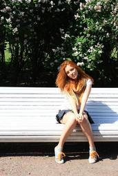 Keywords: park bench summer redhead sun girl nature beautiful green leaves lilac