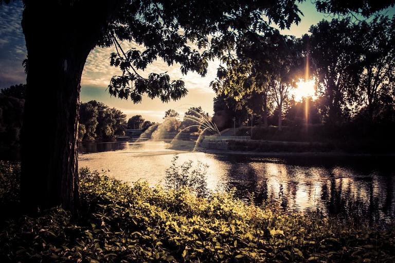 Keywords: park fountain waterspout lake water vegetation reflection mirror surface trees calm tranquil morning sun scene backlight nobody splashing fresh