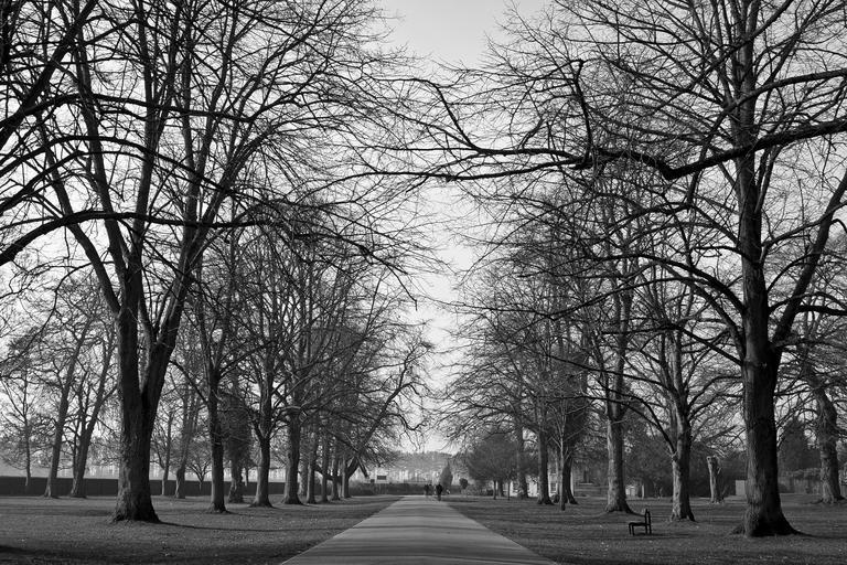 Keywords: parks trees black and white paths pathways roads woods wooden woody plants perennials walkway bright sunny day scenic outdoors nature branches stems flora gardens