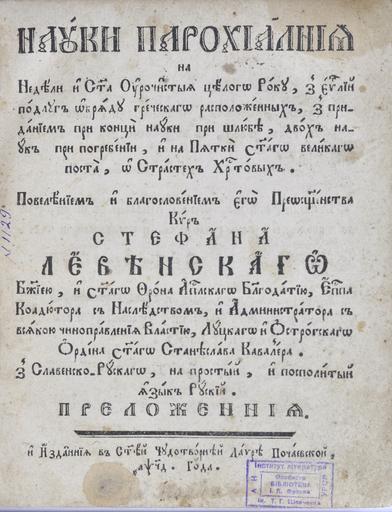 | Keywords: Добриловський Parochial studies1305.jpg Юліян Доб иловський Hаукі па охіальні Почаїв 1794 Титульний а куш З особистої бібліотеки І Ф анка 1794 Institution Shevchenko Institute of Literature Digital Collection PD-old-70-1923 Books from Ukraine 1790 books from Germany Franko Personal Library Collections of books in libraries in Ukraine Shevchenko Institute of Literature Uploaded with VicuñaUploader | ||||