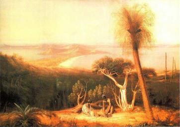 | Keywords: Part of King George III Sound, on the South Coast of New Holland, December 1801.jpg Part of King George III Sound on the South Coast of New Holland December 1801 by William Westall Painted between 1809 and 1812 under Admiralty commission it is a 61 x 86 5 cm oil-on-canvas painting It is part of the Ministry of Defence Art Collection It depicts King George Sound on the south coast of Western Australia Specifically it is a view looking north-north-west from Peak Head across Torndirrup and Vancouver Peninsula towards the mainland The people in the foreground are Australian Aborigines stylised according to the noble savage tradition The shrub on the left is Macrozamia riedlei; the shrub in the centre is Banksia verticillata The tree just right of centre is a Eucalyptus; on the right is the grass-tree Kingia australis then a group of Xanthorrhoea preissii grass-trees This painting is based on Westall's field sketch King George's Sound View from Peak Head and was itself the basis of the engraving View from the south side of King George's Sound Cropped from the ebook version of Findlay Elizabeth 1988 Arcadian Quest available online at www nla gov au/pub/ebooks/pdf/Arcadian 20Quest pdf The Arcadian Quest acknowledge the image as obtained from transparency provided by the National Maritime Museum in Greenwich 1809 “1812 William Westall PD-old-100 <gallery> File King George's Sound View from Peak Head jpg Westall's field sketch King George Sound View from Peak Head File King George's Sound view from Peak Head schematic svg Schematic diagram of the field sketch identifying geographic features File View from the south side of King George's Sound jpg The engraving View from the south side of King George's Sound </gallery> William Westall King George Sound Kingia australis Banksia verticillata Macrozamia riedlei Xanthorrhoea preissii |