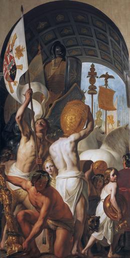 | Keywords: Part of the Triumphal Procession, with Standard-Bearers and Spoils of War, by Pieter de Grebber.jpg en Part of the Triumphal Procession with Standard-Bearers and Spoils of War oil on canvas 383 x 203 5 cm signed b r P DGrebber Ao 1648 1648 https //rkd nl/explore/images/247496 Paleis Huis ten Bosch Oranjezaal Creator Pieter Fransz de Grebber other versions Custom license marker 2016 11 27 PD-old-100 Pieter Fransz de Grebber 1648 Oranjezaal 1648 | ||||