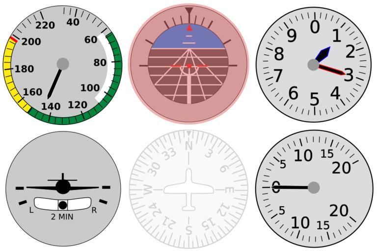 Keywords: Partial panel 7.svg bei Ausfall der Vakuumpumpe fällt der künstliche Horizont und der Kurskreisel aus partial panel hier im Bild transparent abgedeckt falls der künstliche Horizont zusätzlich elektrisch versorgt wird fällt er nur teilweise aus geringere Drehzahl trägere Reaktion Own Luftpirat Flight instruments SVG aircraft instruments |