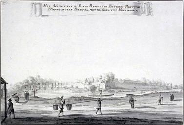 Keywords: Pasar-Bamboo-along-Buitengracht.jpg -6 137890 106 807708 7 en View of the Pasar Bambu seen from the south A sluice in the Buitengracht or outer canal has been built to regulate the water levels in the southern city canal The lock comprises four smaller sluices known as 'boerenverdrieten' farmers' sorrows To the left of the sluice is the bamboo market Bamboo was used as a cheap building material Depicted in the foreground is a man bearing a long bamboo pole Far left is the Utrecht Gate Far right is the Nassau bastion and further the Diest Gate and the roof of the inner hospital - ca 1775 drawing pen and brush 35 5 x 52 cm - Het gezigt van de Passer Bambo van de Euÿterse Port tot de Disport Beuten Batavia met de Selfs 4 Bureverdrit voc person banderole / cartouche / ornamentation building Asians Africans fortification survey / view Bruin M de en B Kist Johannes Rach 1720-1783 Artist in Indonesia and Asia p 38 - 2011-04-11 Atlas of Mutual Heritage - Netherlands Johannes Rach PD-Art Uploaded with UploadWizard Dutch colonial architecture in Jakarta |