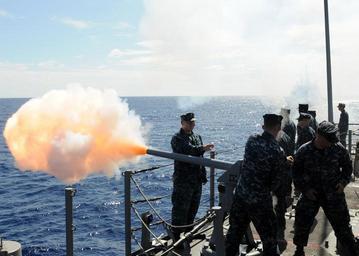 Keywords: Pass-in-review 120928-N-NL541-206.jpg en Sailors assigned to the Oliver Hazard Perry-class guided-missile frigate USS Underwood fire the 40 mm saluting battery for a pass-in-review by Rear Adm Sinclair Harris commander of the U S 4th Fleet during his approach aboard the guided-missile cruiser USS Anzio CG 68 the flagship for UNITAS Atlantic 53-2012 UNITAS is a combined South America- and U S 4th Fleet-sponsored annual exercise that incorporates participants from Brazil Canada Colombia Dominican Republic Mexico and the United Kingdom and the United States U S Navy photo by Mass Communication Specialist 2nd Class Stuart Phillips 2012-09-28 Stuart Phillips https //www dvidshub net/image/674814 120928-N-NL541-206 2012-10-01 18 59 CARIBBEAN SEA AT SEA PD-USGov-Military-Navy Sinclair Harris USS Anzio CG-68 USS Anzio CG-68 Images from DoD uploaded by Fæ |