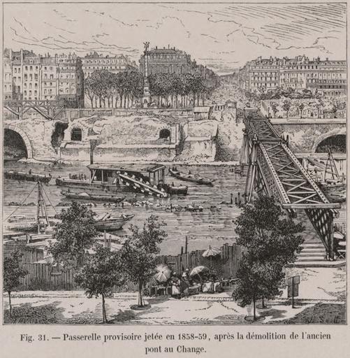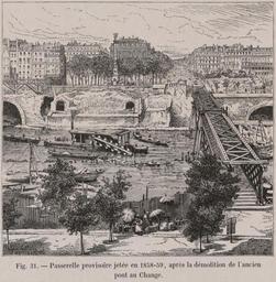 Keywords: Passerelle provisoire jetée en 1858-59, après la démolition de l'ancien Pont au change.jpg Artwork The 1858-1859 pedestrian bridge that was temporarily built to replace the recently demolished Pont au change The Pont au change bridge was originally built in 1647 and was located in the Châtelet district 1875-1882 lithograph 9 8 x 10 6 cm Institution Brown University Library object history exhibition history credit line Published in Theodor Josef Hubert Hoffbauer Paris à travers les âges Paris Firmin-Didot et cie 1885 accession number 1172175960306100 PD-old Lithographs of Paris Images of Paris from the Brown University Library Paris à travers les âges Historical images of Pont au Change Footbridges in Paris 1858 in Paris 1859 in Paris Temporary buildings in France Temporary bridges Place du Châtelet Paris |