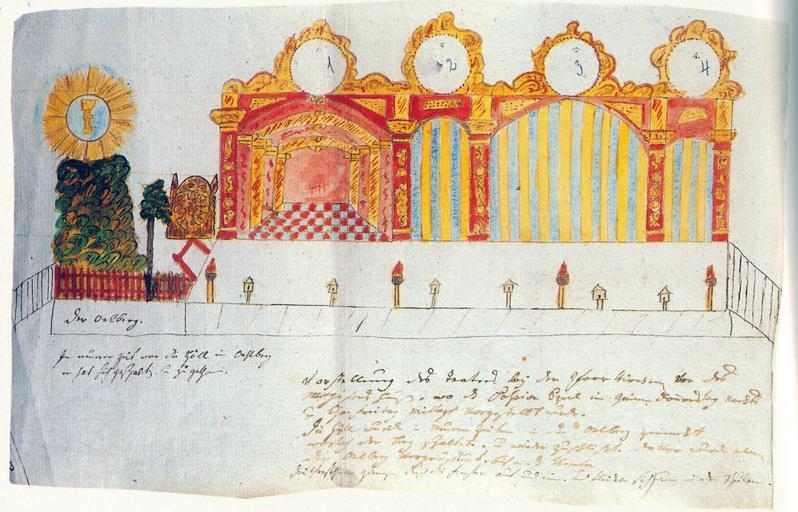 Keywords: Passionsspiel buehne gmuend.jpg Bühne des Schwäbisch Gmünder Passionsspiels Zeichnung von Dominikus Debler in seiner Chronik Stadtarchiv Schwäbisch Gmünd Bd IX S 299 Die Chronik des Dominikus Debler 1756-1836 2006 S 114 Anfang 19 Jahrhundert Dominikus Debler PD-Art Passionsspiel Schwäbisch Gmünd Dominikus Debler Theatre in art |