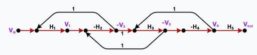 Keywords: Passive band pass ladder filter signal flow-graph normalized.png en The signal flow-graph representation of the ladder filter equations with impedances scaled by R an arbitrary resistance Te signs of the gains have been manipulated so that all gains feeding into a node have the same signs 2015-05-28 own Constant314 other versions cc-zero Uploaded with UploadWizard Electronics Electrical engineering Filters Signal flow graphs Signal processing |