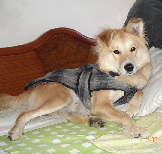 Keywords: Pastor vasco India.jpg en Dog Name Jerry 2 years old own Hillexports 2006-04-01 Basque shepherd dog Dogs wearing clothes Dogs in beds