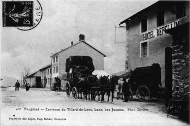 Keywords: Pataches. Lans-en-Vercors. Relais de Jaume.jpg LangSwitch A dirt road is bordered on one side of five houses with one or two floors One of them with two floors have the sign of an hotel Behind it are two stagecoaches They carry passengers The coachman's seat is occupied by two people on one and the other remains free Une route non goudronnée est bordée d ™un seul côté de cinq maisons à un ou deux étages L ™une d ™entre elles de deux étages porte en bandeau l ™enseigne d ™un hôtel Devant celle-ci sont arrêtées en sens inverse deux voitures hipponobiles Elles sont destinées au transport de voyageurs Le siège du cocher est occupé par deux personnes sur l ™une et reste libre pour l ™autre ~ 1900 Technique photograph black place of discovery object history exhibition history credit line fr accession number place of creation Lans Isère Rhône-Alpes France cite web Sylvain Lrconte De 1900 à nos jours Vercors La commune de Lans-en-Vercors http //1900anosjours hpsam info/photos/vercors/lans-en-vercors php 2015 09 13 fr PD-old-100 PD-old-70-1923 Uploaded with UploadWizard Stagecoaches in France Lans-en-Vercors |