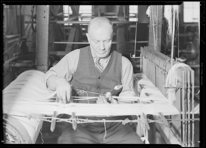| Keywords: Paterson, New Jersey - Textiles. From the warping machine, the warp is taken to the weaving plant - NARA - 518545.jpg Scope and content Paterson New Jersey - Textiles From the warping machine the warp is taken to the weaving plant Here the end is either entered through the haddler of the harness or twisted on to threads which remained entered in the harness Entering will only be done if the construction of the cloth is to be changed If however the construction remains the same entering is not necessary in which case the warp ends will be twisted onto the ends remaining in the harness These ends which are short in length are commonly referred to as the from The operator in the above picture is showin twisting the warp ends on to the from ends General notes 518545 Local identifier 69-RP-306 Federal Works Agency Work Projects Administration National Research Project ca 1941 - ca 1942 NARA-Author Hine Lewis Wickes 1874-1940 Photographer 1122914 <br /> Paterson Passaic New Jersey United States North and Central America inhabited place 4202736 40 917 -74 167 <br /> Still Picture Records Section Special Media Archives Services Division NWCS-S National Archives at College Park 8601 Adelphi Road College Park MD 20740-6001 1936 - 1937 Record group Record Group 69 Records of the Work Projects Administration 1922 - 1944 Record group ARC 398 Lewis Hine Photographs for the National Research Project compiled 1936 - 1937 Series ARC 518291 File unit File unit ARC Variant control numbers NAIL Control Number NWDNS-69-RP-306 Other versions <gallery> File Paterson _New_Jersey_-_Textiles _From_the_warping_machine _the_warp_is_taken_to_the_weaving_plant_-_NARA_-_518545 tif tif File Paterson _New_Jersey_-_Textiles _From_the_warping_machine _the_warp_is_taken_to_the_weaving_plant_-_NARA_-_518545 jpg jpg </gallery> NARA-cooperation PD-USGov Weaving preparation Paterson New Jersey-Textiles Cotton mill workers |