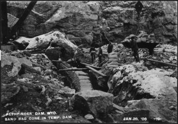 | Keywords: Pathfinder Dam. Sandbag core wall in temporary dam - NARA - 294363.jpg Scope and content Photograph from Volume One of a series of photo albums documenting the construction of Pathfinder Dam and other units on the North Platte Project in Wyoming and Nebraska General notes 294363 Local identifier Department of the Interior Bureau of Reclamation Engineering and Research Center 05/18/1981 - 03/04/1988 NARA's Rocky Mountain Region Denver NRGA Building 48 Denver Federal Center West 6th Avenue and Kipling Street Denver CO 80225-0307 1906-01-28 Record group Record Group 115 Records of the Bureau of Reclamation 1889 - 2008 Record group ARC 444 Photograph albums compiled 1903 - 1972 Series ARC 293611 File unit File unit ARC Variant control numbers NAIL Control Number NRG-115-CONSTPHO85006-NOPLATTE148 Other versions <gallery> File Pathfinder Dam Sandbag core wall in temporary dam - NARA - 294363 tif tif </gallery> NARA-cooperation PD-USGov Construction of the Pathfinder Dam |