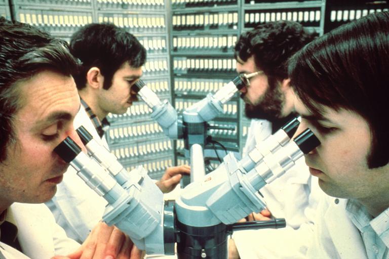 | Keywords: Pathologists looking into microscopes.jpg Four male scientists all seated and looking through at a four-headed microscope They are all wearing white lab coats The simultaneous examination of tissue from a difficult case assists pathologists in their diagnosis Topics/Categories People -- Adult People -- Health Professional Science and Technology -- Laboratory Techniques/Equipment Type Color Photo Source National Cancer Institute Linda Bartlett photographer 2019 1980 Reuse Restrictions None - This image is in the public domain and can be freely reused Please credit the source and/or author listed above Linda Bartlett photographer PD-USGov-HHS-NIH Media from National Cancer Institute Visuals Online Images uploaded by Fæ People with microscopes |