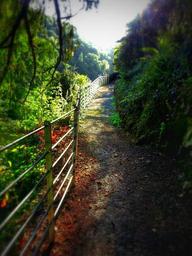 Keywords: pathway railings trees nature landscape footpath tree scene walk view peaceful outdoor natural walkway railing path