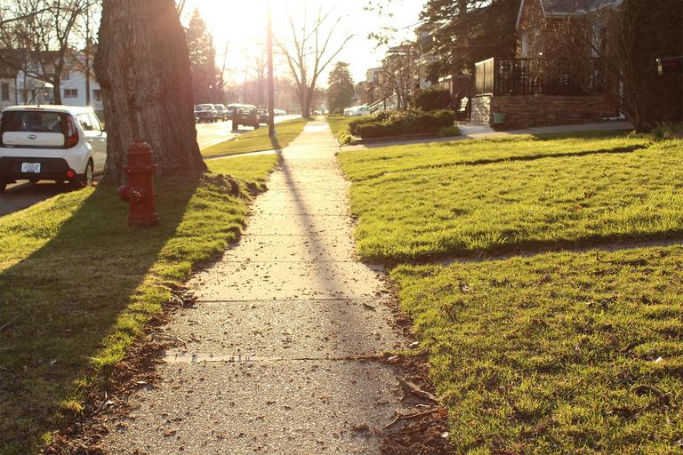 Keywords: pathway walkway sidewalk landscape nature walk tree outdoor sunny sun travel wood grass leaves city walk city neighborhood