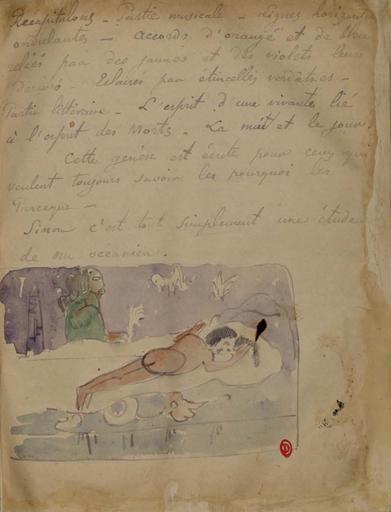 Keywords: Paul Gauguin - Cahier pour Aline - Spirit of the Dead Watching.jpg Artwork Creator Paul Gauguin 1893 of Spirit of the Dead Watching under the title Genèse d'un tableau Genesis of a picture accompanied by a watercolor sketch op cit Gamboni It is here that Gauguin remarked the title Manao tupapau can be understood in two ways i e as watching the spirit and the spirit watching The text reads in translation To recapitulate Musical part - undulating horizontal lines - harmonies in orange and blue linked by yellows and violets from which they derive The light and the greenish sparks Literary part - the spirit of a living girl linked with the spirit of Death Night and Day This genèse is written for those who always have to know the whys and wherefores Otherwise the picture is simply a study of a Polynesian nude accession number NUM MS 227 place of creation http //bibliotheque-numerique inha fr/collection/5749-cahier-pour-aline/ Bibliothèque de l'Institut National d'Histoire de l'Art collections Jacques Doucet PD-old-70-1923 Nineteenth-Century Art Worldwide 2003 2 3 http //www 19thc-artworldwide org/autumn03/73-autumn03/autumn03article/274-paul-gauguins-genesis-of-a-picture-a-painters-manifesto-and-self-analysis Uploaded with UploadWizard Spirit of the Dead Watching |
