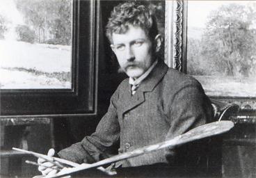 Keywords: Paul-Scheffer-Maler.jpg de schwarz-weiß Photo des Malers Paul Scheffer mit Pinsel und Palette aus einem Photoalbum Esser ca 1910 PD-old Paul Scheffer