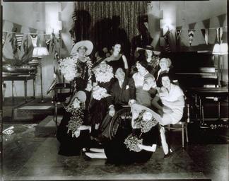 | Keywords: halloween greenwich village greenwichvillage jessie tarbox beals jessietarboxbeals indoor Nine women (some seated, some standing) positioned around a man in a wheelchair (who is looking to his left and smiling at a woman). Five women wear flowers around their necks, one woman holds a pig mask. A large model ship is on the left side of the room and a piano is on the right. Pennants have been hung close to the walls, ca. 1932-1935 Photographer: Jessie Tarbox Beals Catalog Record: via.lib.harvard.edu/via/deliver/deepLink?_collection=via&... Questions? Ask a Schlesinger Librarian Nine women (some seated, some standing) positioned around a man in a wheelchair (who is looking to his left and smiling at a woman). Five women wear flowers around their necks, one woman holds a pig mask. A large model ship is on the left side of the room and a piano is on the right. Pennants have been hung close to the walls, ca. 1932-1935 Photographer: Jessie Tarbox Beals Catalog Record: via.lib.harvard.edu/via/deliver/deepLink?_collection=via&... Questions? Ask a Schlesinger Librarian |