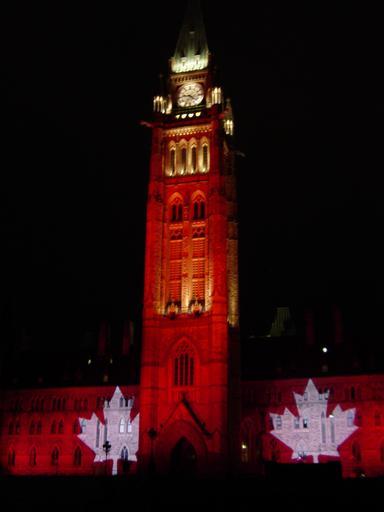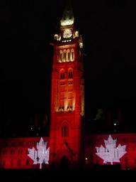 Keywords: Peace Tower at night with maple leaves.jpg Author en User Siqbal <br /> Description The Peace Tower at night lit in red and white with maple leaf designs <br /> Date Uploaded as en Image DSC00226 JPG on April 24 2005 <br /> Siqbal en Peace Tower Night in Ottawa-Gatineau Maple leaf as symbol of Canada |