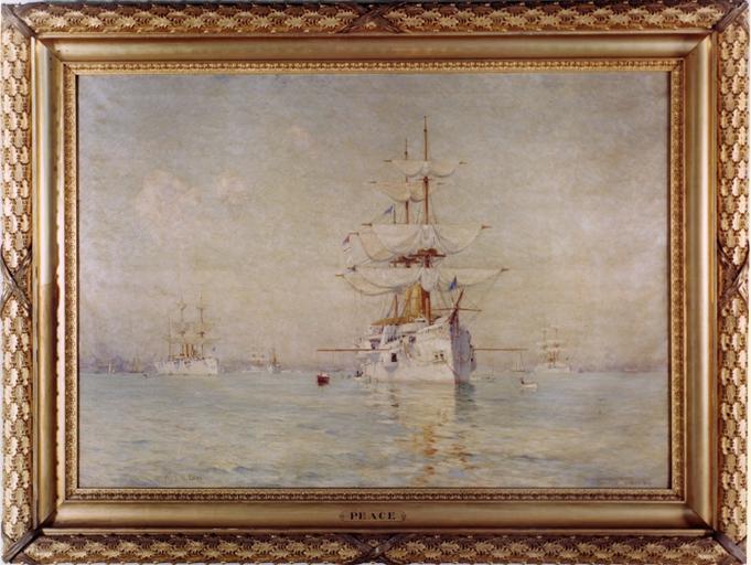 Keywords: Peace - Walter L Dean.jpg en Peace The White Squadron in Boston Harbor was painted by Walter Lofthouse Dean in 1893 It depicts American warships performing exercises and maneuvers Chicago the largest ship is in the foreground; behind her are the cruisers Atlanta Boston and Newark and the gunboat Yorktown Other vessels and the city of Boston including the Massachusetts State House dome and Bunker Hill Monument appear in the distance Peace was first hung in the Capitol in 1900 in the room of the House Committee on Naval Affairs The painting remained with the committee throughout various relocations in the Capitol and in 1919 to the Cannon House Office Building; Peace is now on view in room 311 and has been recently restored Walter Lofthouse Dean 1854-1912 was born in Lowell Massachusetts and later established studios in Boston and Gloucester to paint fishing and harbor scenes He is regarded as one of the leading American marine painters Architect of the Capitol www capitol gov/html/IMG_2010061786143 html Architect of the Capitol Walter L Dean 1891-01-01 PD-EdictGov 19th-century sailing ships in paintings Cannon House Office Building 1893 paintings Template artwork possible