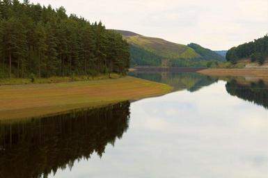 Keywords: peak district reservoir howden reservoir dam howden dam 617 squadron dam busters trees calm water reflections