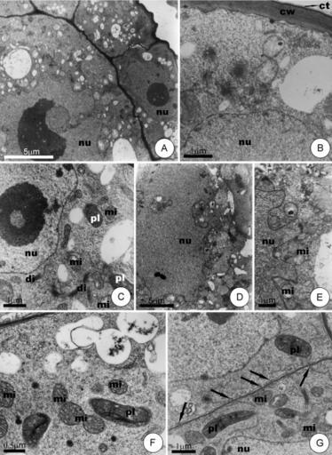 Keywords: Pearl Bodies04.jpg en A “G Transmission electron microscopy images of Cissus verticillata food bodies in the reserve accumulation phase A Food body showing cells in both the epidermal and internal layers with dense cytoplasm and large nuclei B Epidermal cell; mitochondria can be seen in the cytoplasm among a few other organelles; note the poorly developed crista in the mitochondria and the dictyosomes The nucleus is globose and central C Internal cell with mitochondria with well-developed crista plastids and dictyosomes D E Detail of the nuclear region of an internal cell demonstrating a lobed nucleus; in E observe the presence of mitochondria between the lobes formed by the nuclear membrane F G Cytoplasm of an internal cell; note the presence of plastids and mitochondria Note the electron-dense stroma of the plastids and their poorly developed membrane systems Note in G the plasmodesmata arrows uniting adjacent cells and the smooth endoplasmic reticulum near the plasma membrane Abbreviations ct cuticle; cw cell wall; di dictyosomes; mi mitochondria; nu nucleus; pl plastids http //www ncbi nlm nih gov/pmc/articles/PMC2707332/ Elder Antônio Sousa Paiva Rafael Andrade Buono and Julio Antonio Lombardi 2008 Pearl bodies Cissus verticillata PD-USGov