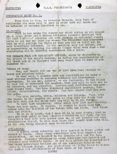 | Keywords: pearl harbor pearlharbor attack december 7 1942 december71942 world war two worldwartwo text document Document from the Pearl Harbor Dispatch Special Collection which details the attack and the days following it. Repository: San Diego Air and Space Museum Archive Document from the Pearl Harbor Dispatch Special Collection which details the attack and the days following it. Repository: San Diego Air and Space Museum Archive | ||||