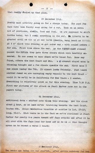 | Keywords: pearl harbor pearlharbor attack december 7 1942 december71942 world war two worldwartwo document text Document from the Pearl Harbor Dispatch Special Collection which details the attack and the days following it. Repository: San Diego Air and Space Museum Archive Document from the Pearl Harbor Dispatch Special Collection which details the attack and the days following it. Repository: San Diego Air and Space Museum Archive | ||||