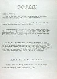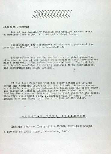 | Keywords: pearl harbor pearlharbor attack december 7 1942 december71942 world war two worldwartwo text document Document from the Pearl Harbor Dispatch Special Collection which details the attack and the days following it. Repository: San Diego Air and Space Museum Archive Document from the Pearl Harbor Dispatch Special Collection which details the attack and the days following it. Repository: San Diego Air and Space Museum Archive | ||||