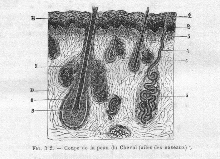 | Keywords: PeauCvChauveau1890MeyCh.jpg en Histology of the skin of the horse Equus caballus fr Coupe de la peau du cheval Equus caballus aile des naseaux <br /> E épiderme D derme<br /> 1 couche cornée de l'épiderme 2 corps muqueux de Malpighi 3 couche papillaire du derme 4 canal excréteur d'une glande sudoripare 5 glomérule d'une glande sudoripare 6 follicule pileux 7 glande sébacée 8 gaine interne du follicule pileux 9 bulbe du poil 10 pelloton adipeux <br /> ” Chauveau Auguste Arloing Saturnin Traité d'anatomie comparée des animaux domestiques <br /> 1 064 p page 902 1890 Paris Lib J B Baillière et Fils domaine public décès des auteurs 1917 et 1911 Meyer Ch 2011-03-24 PD-old Animal histology Animal skin Horse skin |