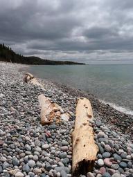 Keywords: pebble beach shoreline water lake logs weather
