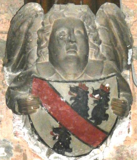 Keywords: PedertonArms NaveCorbel PoltimoreChurch Devon.PNG Sir Coplestone Warwick Bampfylde 3rd Baronet c 1689 “1727 of Poltimore John VI and his wife Agnes Pederton rebuilt the Parish Church of Poltimore as is evidenced by an inscribed ledgerstone said by Worthy 1896 to have been moved from the nave to the chancel bearing the following Latin text Worthy Charles Devonshire Wills A Collection of Annotated Testamentary Abstracts together with the Family History and Genealogy of Many of the Most Ancient Gentle Houses of the West of England London 1896https //archive org/details/devonshirewillsc00wortiala MCCCXC Hic jacent Joh ann es Baunfeld et Agnes uxor eius pat er et mat er Will ielm i Baunfeld qui ha n c ecclesia m et maxima m campana m fieri fecer u nt 1390 Here lie John Bampfield and Agnes his wife the father and mother of William Bampfield who caused to come into being this church and the greatest bell </br> Missing letters in the Latin inscription omitted to save sculpting labour are indicated by tildes placed over missing letters The arms are Bampfield later Baron Poltimore impaling Pederton Argent a bend gules between three lion's heads erased and ducally crowned sable Summers Peter Titterton John eds Hatchments in Britain Vol 7 Cornwall Devon Dorset Gloucestershire Hampshire Isle of Wight and Somerset; Phillimore Press Chichester Sussex 1988 p 29 own photo Lobsterthermidor <span class signature-talk ></span> 12 51 19 August 2015 UTC 2015 Poltimore Pederton arms |