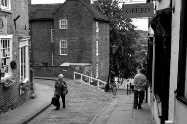 Keywords: pedestrians lincoln lincolnshire cathedral precinct steep hill old buildings shop sign