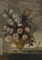 Keywords: Pedro de CamprobÃn Still Life of Iris, Lilies, Roses and Carnations In Elaborate Urn.jpg Still life of iris lilies roses and carnations in elaborate urn with a blue and white cup and a small glass vase; landscape beyond one of a pair oil on canvas 94 x 73 7 cm http //www sothebys com Sotheby's Sale N08952 New York 2013-01-31 “2013-02-01 century 17 Creator Pedro de CamprobÃn PD-art-100 Images from Sotheby's Paintings by Pedro de CamprobÃn Still life paintings of flowers Still-life paintings with irises |
