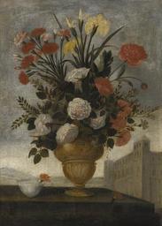 Keywords: Pedro de CamprobÃn Still Life of Iris, Lilies, Roses and Carnations In Elaborate Urn 2.jpg Still life of iris lilies roses and carnations in elaborate urn with a blue and white cup and a small glass vase; landscape beyond one of a pair oil on canvas 94 x 73 7 cm http //www sothebys com/en/auctions/ecatalogue/2013/old-master-paintings-n08952/lot 241 html Sotheby's Sale N08952 New York 2013-01-31 “2013-02-01 century 17 Creator Pedro de CamprobÃn PD-art-100 Images from Sotheby's Paintings by Pedro de CamprobÃn Still life paintings of flowers Still-life paintings with irises |