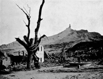 Keywords: Pelee 1902 5.jpg Mt Pelee is also notable for the growth of volcanic spines rigid columns of solidified lava pushed above the throat of the volcano This view from the south section of St Pierre looking up to Mt Pelee Note the volcanic spine at the summit of the volcano 1902 Photograph by Angelo Heilprin United States 1853-1907 PD-old 1902 eruption of Mount Pelée Lava spines Photographs by Angelo Heilprin |