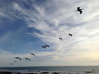 Keywords: pelican flying birds skies ocean blue blue sky sea coast