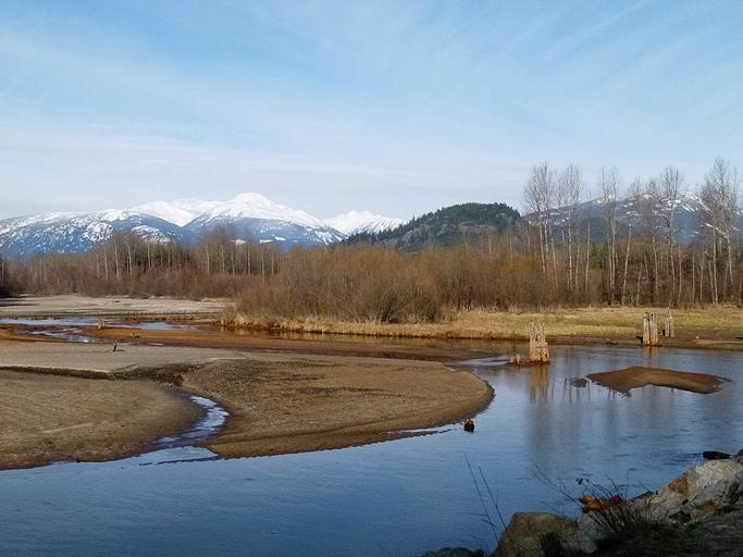 Keywords: pemberton birkenhead river britsh columbia canada wetland marshland river bank mountains springtime landscape alpine scenery nature snow