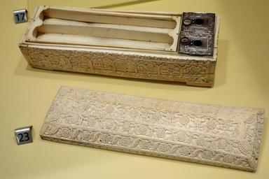 Keywords: Pen case, North India, Mughal period, c. 1800, ivory - Royal Ontario Museum - DSC04567.JPG en Exhibit in the Royal Ontario Museum Toronto Ontario Canada This work is old enough so that it is in the public domain Photography was permitted in the museum without restriction 2013-10-08 16 49 58 own Daderot cc-zero Sir Christopher Ondaatje South Asian Gallery at the Royal Ontario Museum Uploaded with UploadWizard Mughal ivory